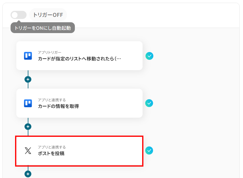 このワークフローは、TrelloとX(Twitter)を連携させることで、特定のカード更新をトリガーに自動でポスト投稿を実行するため、情報発信の効率化を実現します。