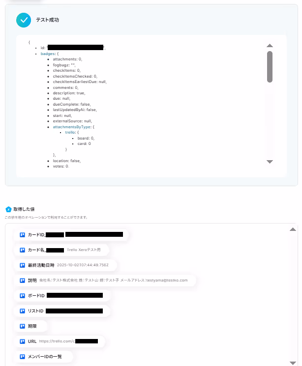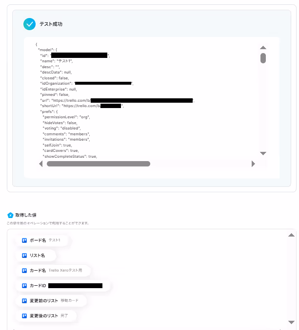 Trello内でカードを指定のリストに移動させたら再び連携テストを行います。このテストでは、Trelloのカードのデータを取得します。