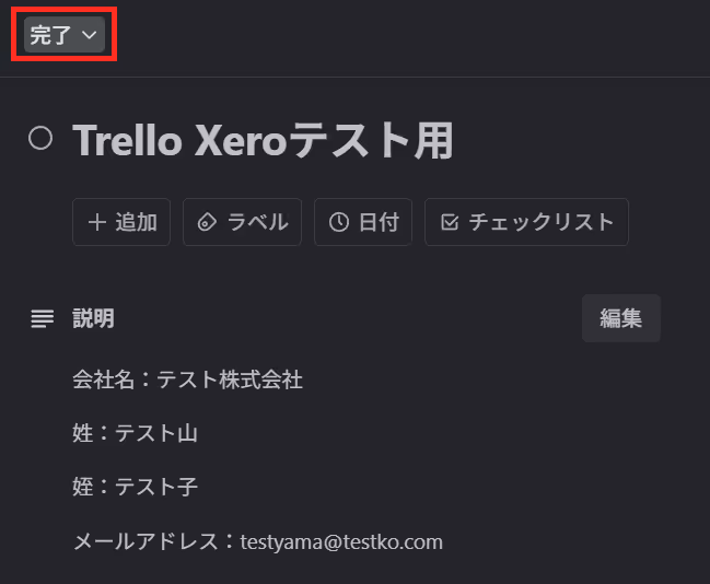 この例では後続オペレーションのXeroに連携させることを想定して、指定したボード内に以下のようなカードを作成してみました。