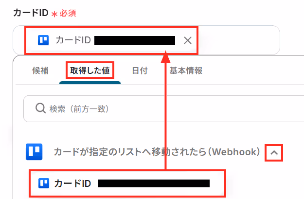「カードID」はアプリトリガーで検知した、移動されたカードIDを取得した値から選択しましょう。