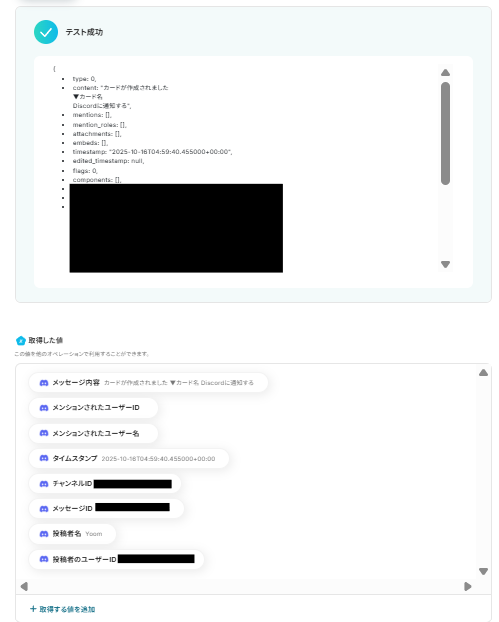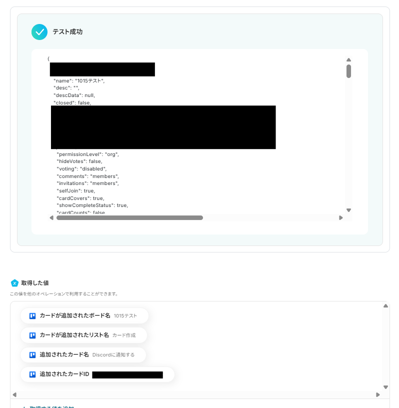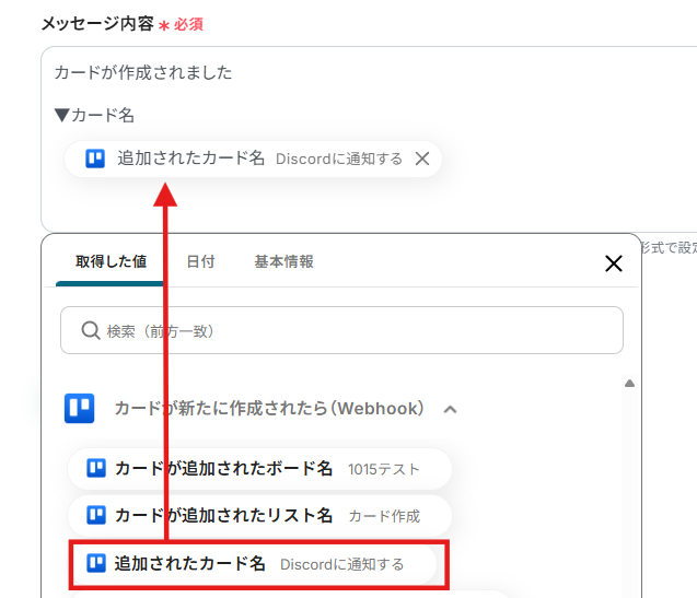 メッセージ内容にはTrelloから取得した値を用いて「追加されたカード名」を入力しました。