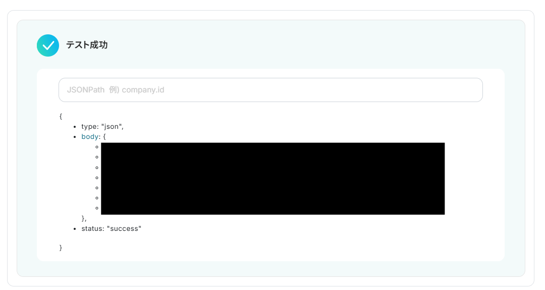 入力ができたら「テスト」をクリックし、以下の画面のようにテストが成功するか確認します。