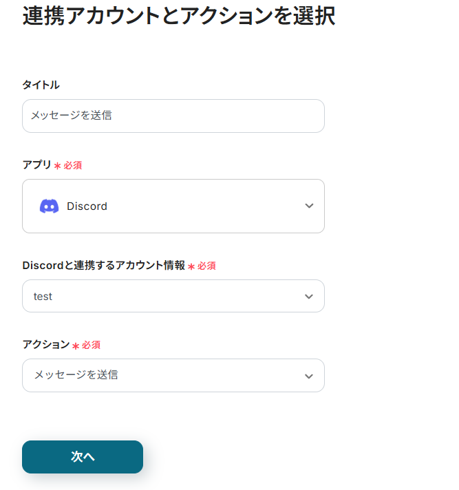 連携アカウントとアクションを選択する画面が表示されるので、今回連携するDiscordのアカウントを確認し「次へ」をクリックします。