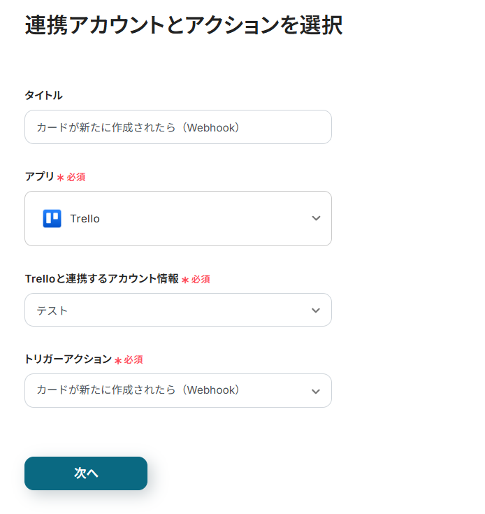 連携アカウントとアクションを選択する画面が表示されるので、今回連携するTrelloのアカウントを確認し「次へ」をクリックします。