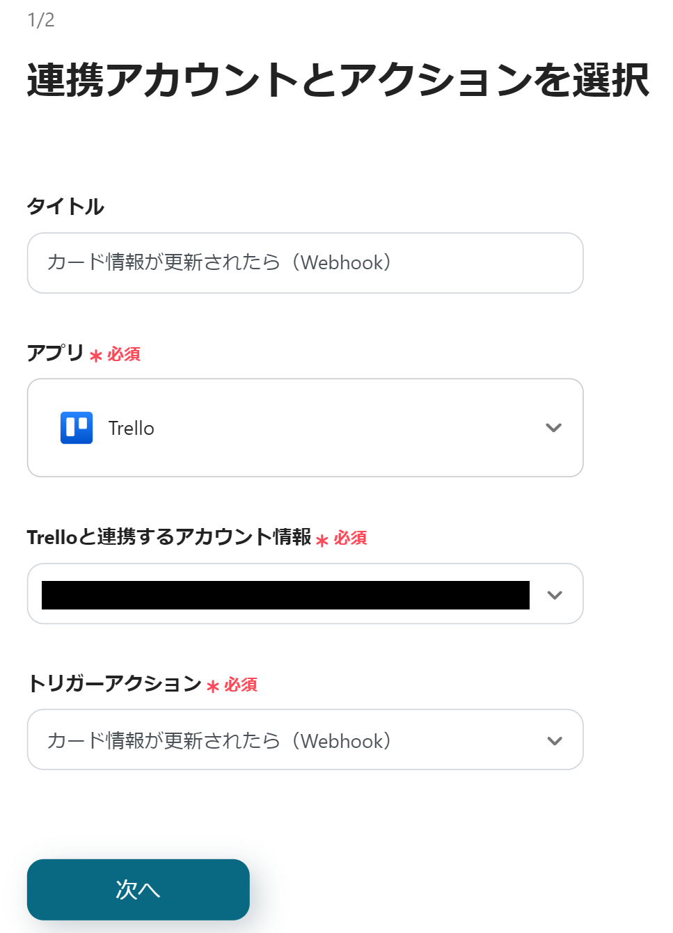 最初にTrelloの設定を行うために、「カード情報が更新されたら(Webhook)」をクリックしてください。