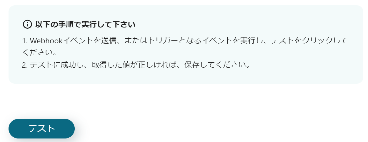 以下の画面が表示されたら、説明を確認して「テスト」→「テスト成功」→「保存」を行ってください。