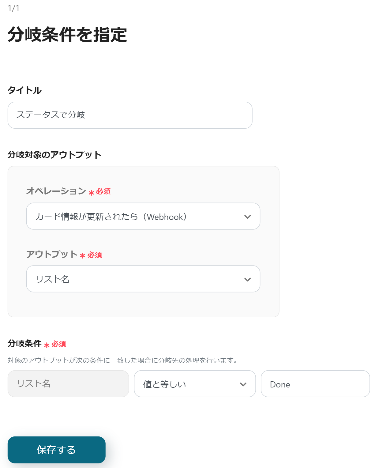 続いて、ステータスによって分岐する設定を行うため、「ステータスで分岐」をクリックします。