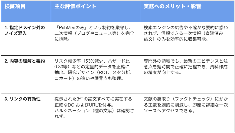 架空の文献を生成することなく、実在する最新のエビデンスを確実に接続できるこの正確性は、研究者や医療従事者がAIを「実務のパートナー」として活用するための決定的な強みと言えます。
