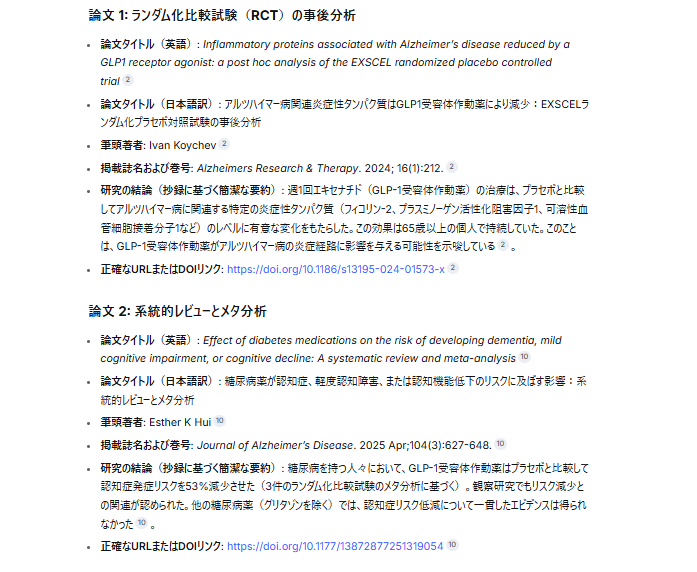 DeepSeekは、「PubMedのみを情報源とする」という厳しい制約を見事に遵守しました。出力結果には、ニュースサイトや個人のブログといった二次情報は一切含まれず、査読済みの学術論文のみが抽出されています。一般的なAI検索では、広告やまとめサイトが混入してエビデンスの純度が下がるケースが散見されますが、本検証ではノイズが完全に排除されました。