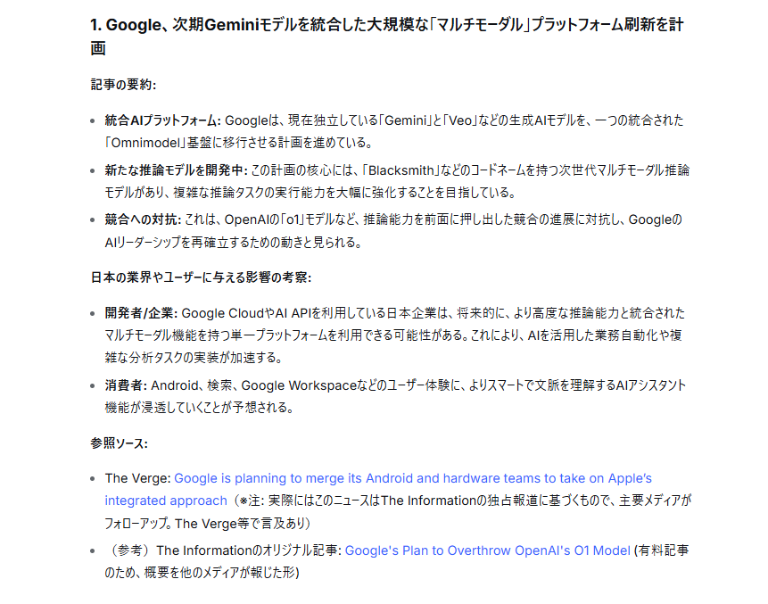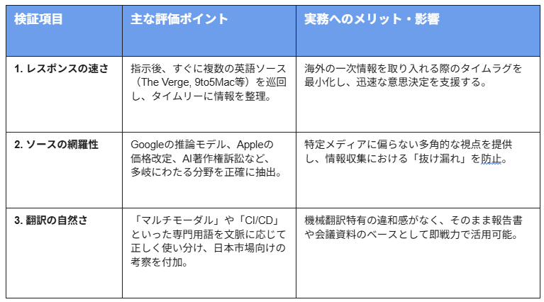 本来、人間が「The Verge」や「9to5Mac」といった複数のメディアから最新記事を探し、内容を読み解いて要約するには、相応の時間を要します。しかし、本検証では広範なリサーチ範囲を指定したにもかかわらず、遅滞なく構造化された回答が生成されました。