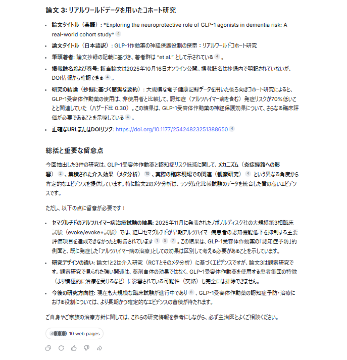 特筆すべきは、指定された3件の論文(RCT、メタ分析、コホート研究)を抽出するだけでなく、各研究の特性(メカニズム、介入効果、臨床現場での関連)を多角的に総括している点です。出力結果は、専門外の人間が数時間かけて行う文献調査を1分程度で完結させており、情報の信頼性を担保しつつ、リサーチ業務の圧倒的な高速化を実現できる強力なツールだと感じました。