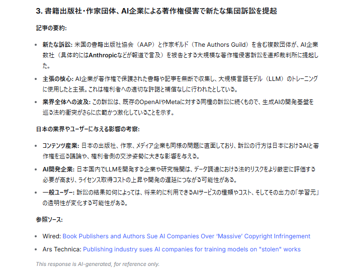 例えば、Appleの施策が「個人開発者やスタートアップ」に与える影響や、著作権訴訟が日本の「コンテンツ産業」に及ぼす法的リスクの考察など、日本独自の市場背景を汲み取った意訳がなされています。読み手が違和感を抱くことなく、情報の核心をダイレクトに理解できるこの言語能力は、英語アレルギーを持つユーザーにとっても大きな助けとなります。