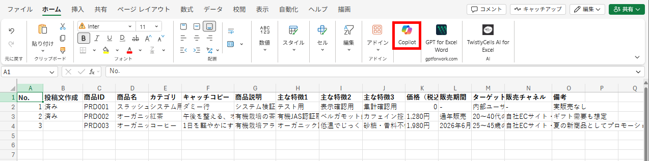 まずは、Excelで管理している商品情報をCopilotに読み込ませて、SNS投稿文を作成する検証を行いました。事前に、以下のように架空の商品データをまとめたシートを用意しておき、Copilotを起動します。