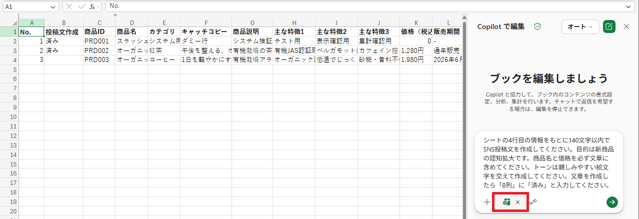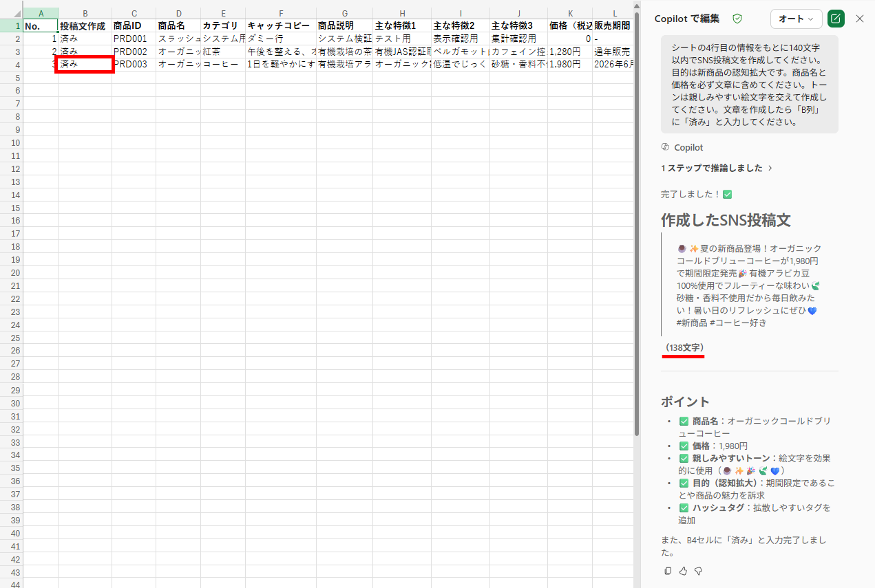 生成された結果から、CopilotはExcelのシート情報を正確に読み取り、指定した内容を投稿文へ反映できることがわかりました。日頃からExcelで投稿データを管理している場合、プロンプトへ商品情報を入力する手間が省けるため便利です。また、Copilotはシートの直接操作も可能なため、投稿文の作成完了後に自動でチェックを入れる指示を追加すれば、どこまで作業が進んだか一目で把握でき、進捗管理がスムーズになります。