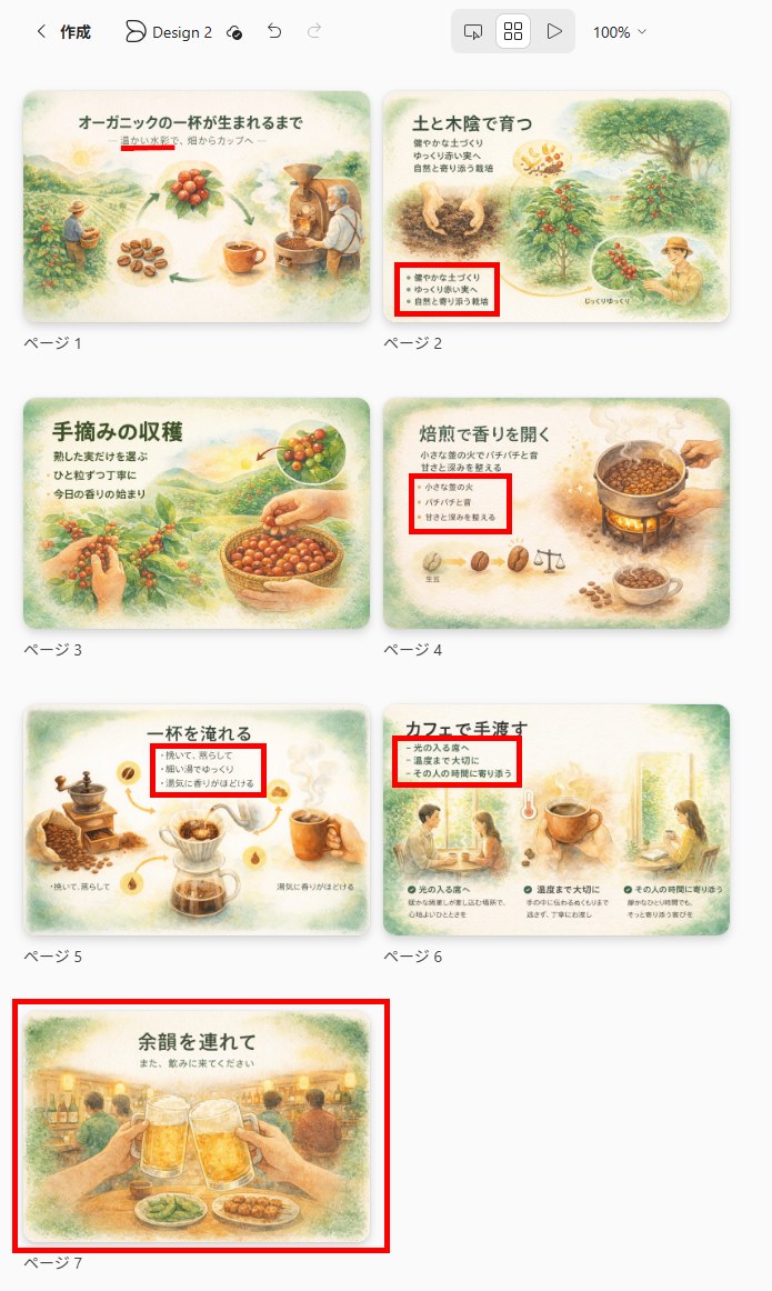 しかし、実用化に向けてはいくつか課題も残ります。画像内の日本語に文字化けはないものの、同じ情報が繰り返し記載されてくどい印象になったり、プロンプトで指定した「水彩画」という指示そのものがテキストとして画像に紛れ込んでしまったりしました。また、画像ごとにフォントの大きさが異なるなど、文章の描画能力にはばらつきが見られます。さらに、コーヒーに関する指示にもかかわらず最後の1枚がビールの絵になるなど、文脈の処理と描画の連携には不安定な部分があります。SNSに投稿する前にはすべての画像を細かく確認し、必要に応じて生成し直すなどの対応が必要です。