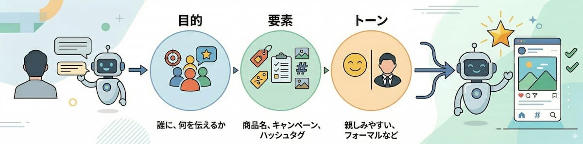 まず「誰に向けて、何を伝えたいのか(目的)」を設定し、次に「含めるべき商品名やキャンペーン情報、ハッシュタグ(要素)」を列挙します。最後に「親しみやすい、フォーマルなど(トーン)」を指定します。これらを明確に伝えることで、AIがユーザーの意図を正確に汲み取るようになり、修正の手間が少ない、イメージ通りの投稿文や画像の生成につながります。