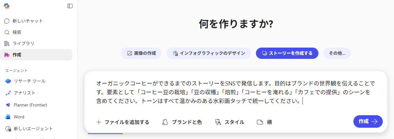 SNSでの継続的な連載投稿を想定し、複数の画像を同時に生成する検証を行いました。Copilot Chatの「作成」メニューから「ストーリーを作成する」を選択し、以下のプロンプトを送信しました。