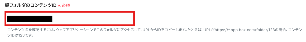 画面の案内に沿って、Boxでフォルダを作成したい親フォルダのコンテンツIDを入力します。