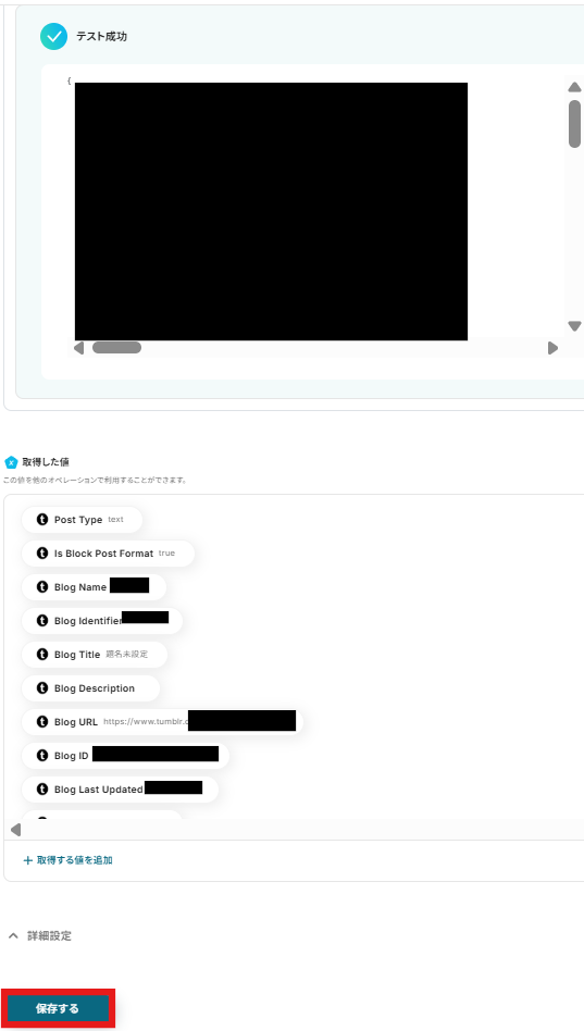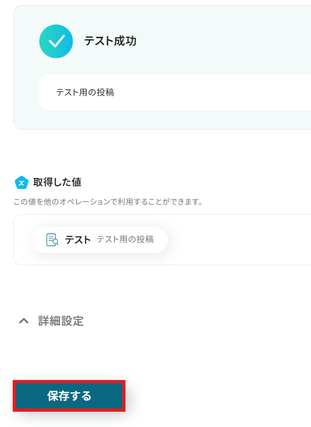 すべて入力できたらテストを実行してみましょう。テストが成功したら、保存して次へ進みます。