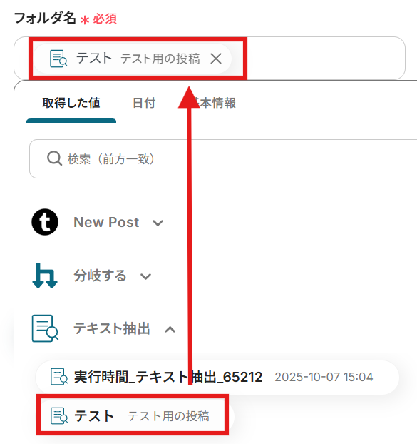 フォルダ名を入力します。フォルダ名として設定したい項目を先ほどの「テキスト抽出」で取得した値から選択しましょう。 このように取得した値を活用することで、Tumblr内に含まれているデータをBoxに反映できます。