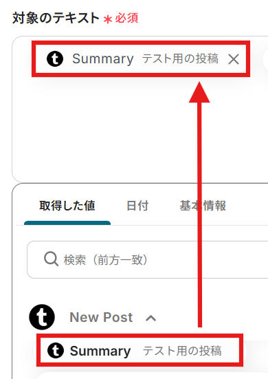 対象のテキストは、Tumblrのテストで取得した値から選びましょう。 入力欄をクリックすると選択肢が表示されます。