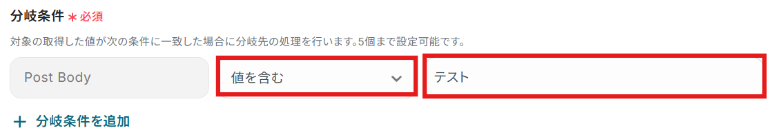 分岐条件は一致した場合のみ分岐先の処理を行うため、対象としたい内容を入力しましょう。以下の画像では「テスト」というワードが含まれている場合のみBoxにフォルダを作成する設定になっています。任意でワードを変更してください。 入力が完了したら保存します。