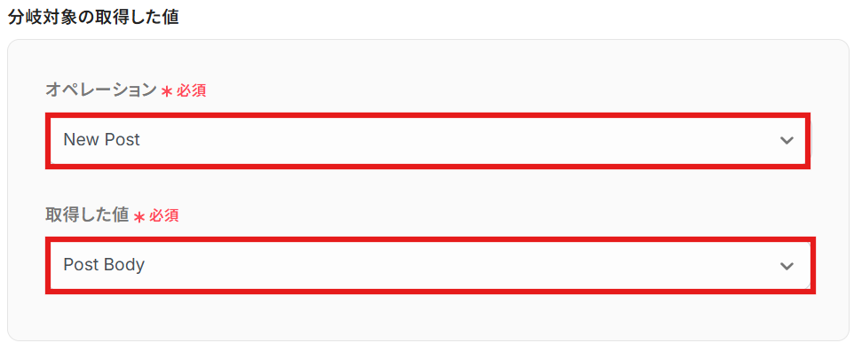 分岐対象の取得した値は、オペレーション、取得した値のそれぞれに対象としたい項目を選択しましょう。
