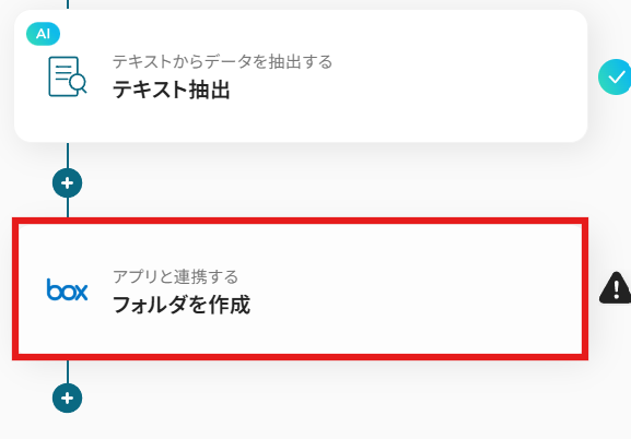 分岐機能では、投稿に特定のキーワードが含まれている場合のみ後続の処理を実行するなど、任意の条件を設定してください。 AIによるテキスト抽出では、Tumblrの投稿本文からフォルダ名として利用したいキーワードなど、任意の情報を抽出するように設定してください。 Boxでフォルダを作成するアクションでは、作成先となる親フォルダのIDを任意で設定してください。 ■注意事項