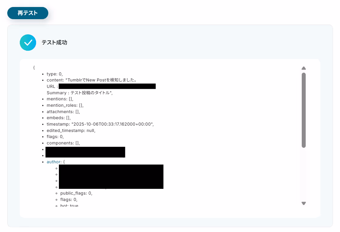 テストが成功するとテスト成功画面と取得した値が表示され、Tumblrのブログデータが確認できます。「保存する」をクリックして完了です!