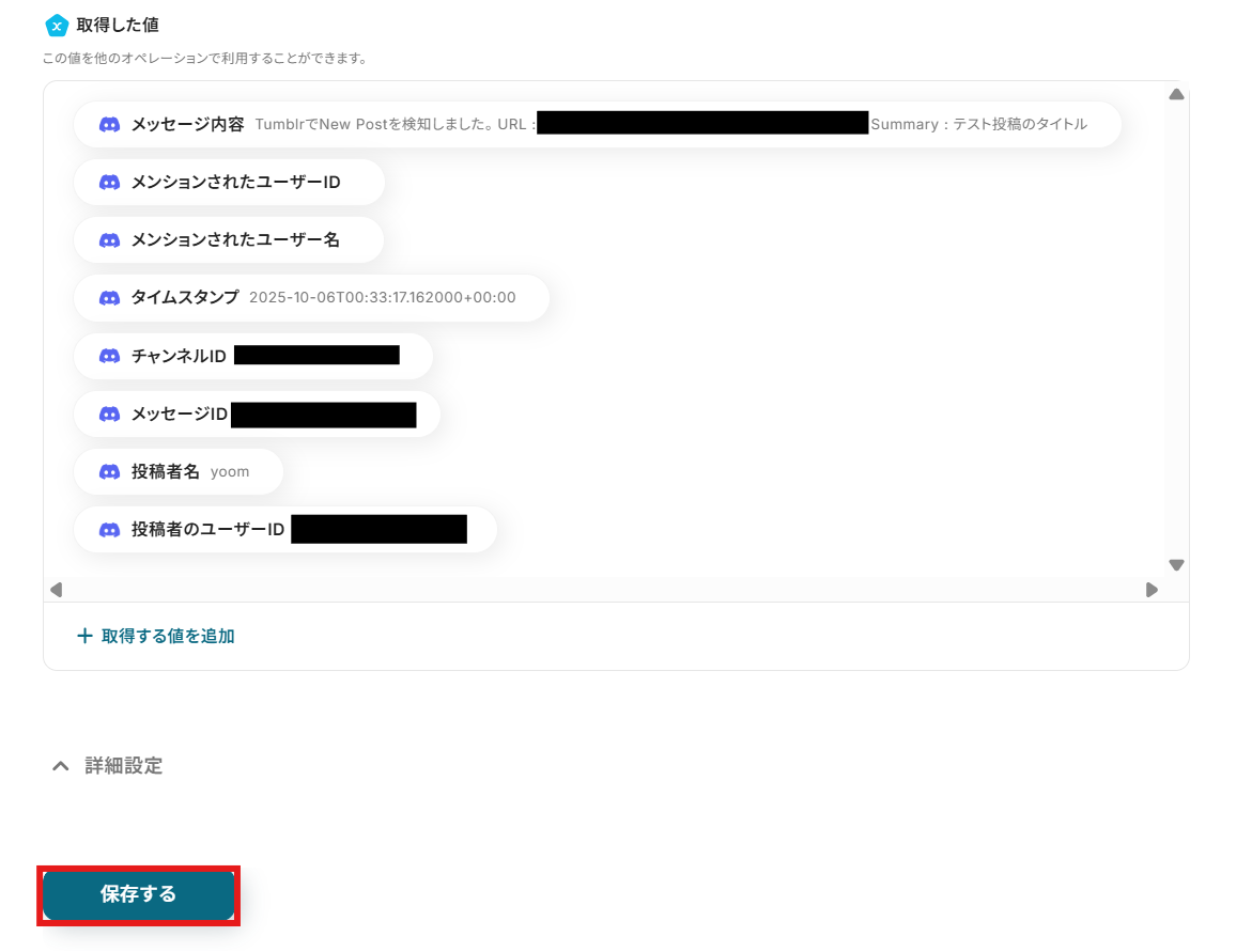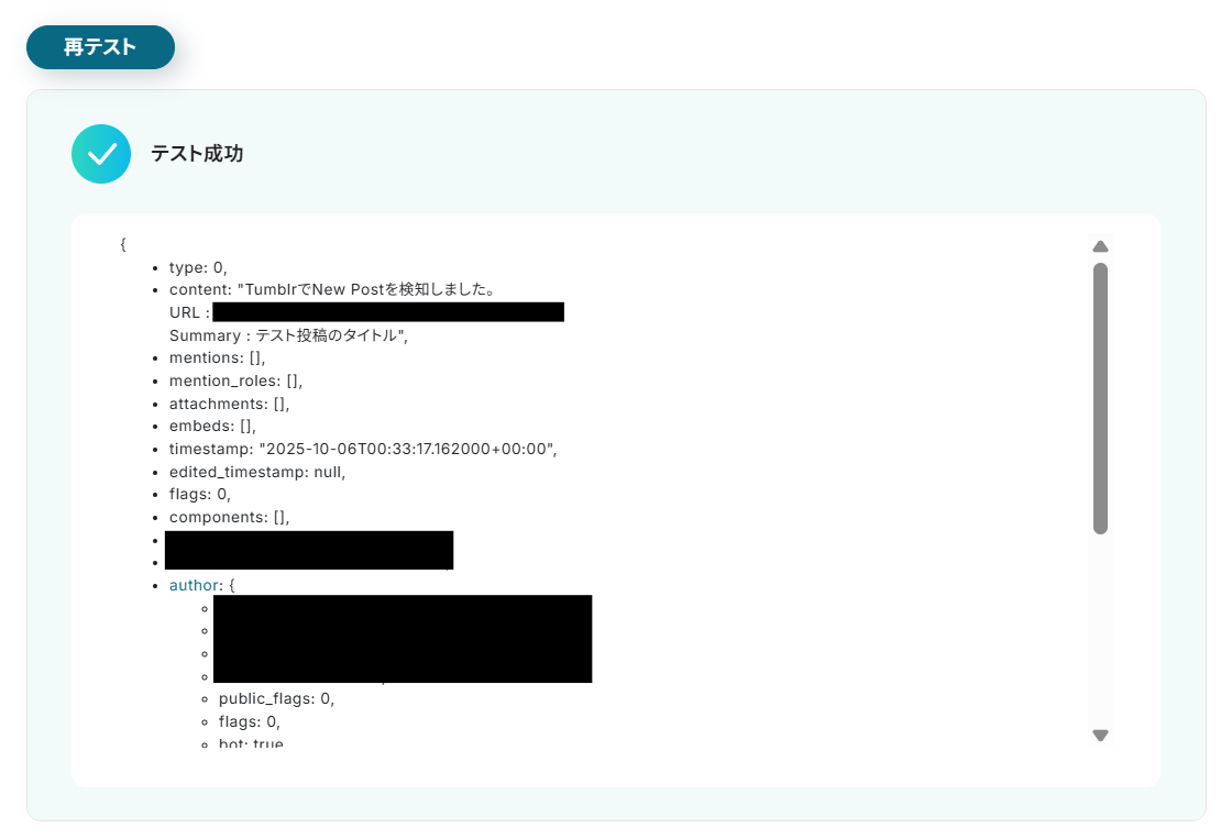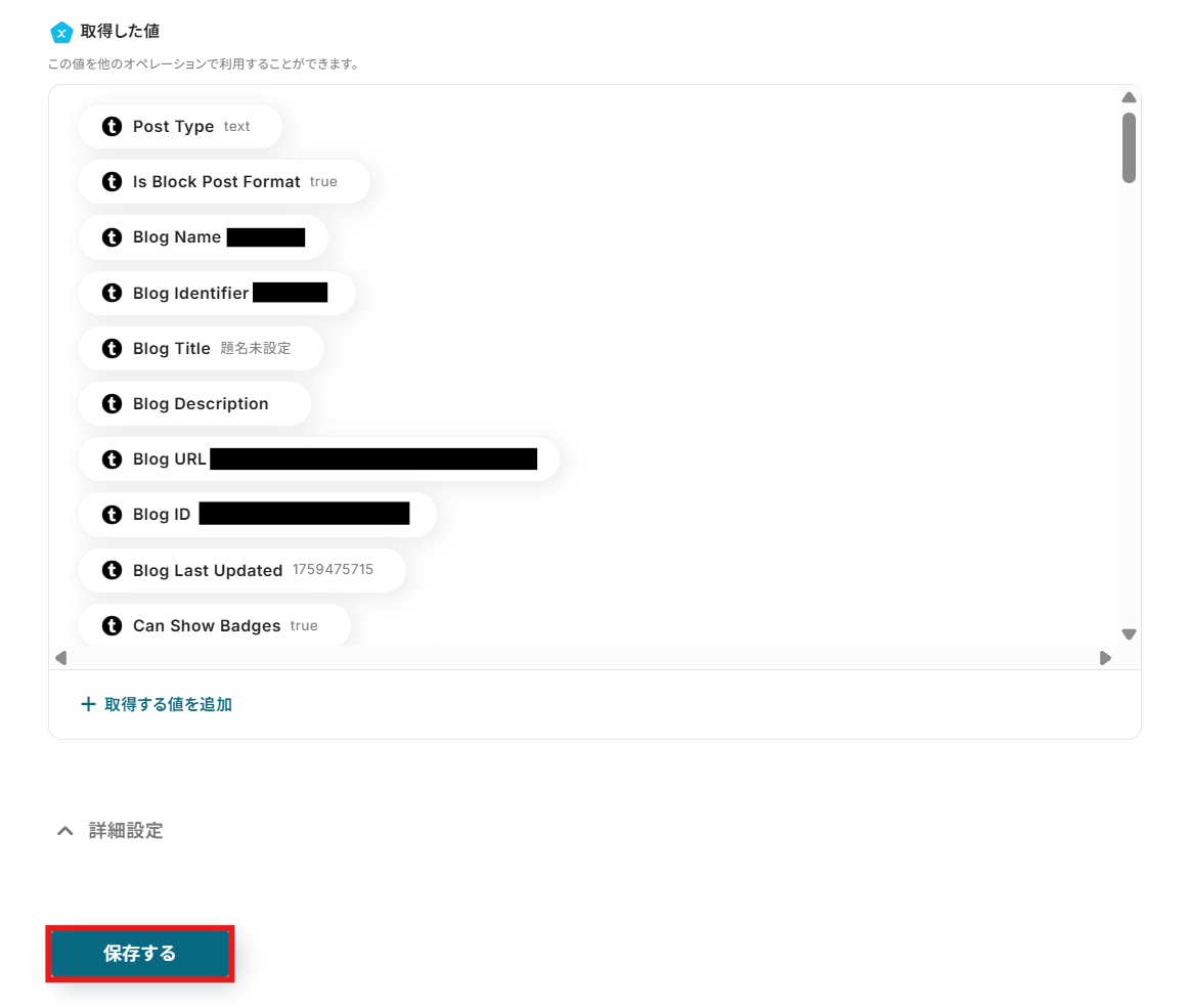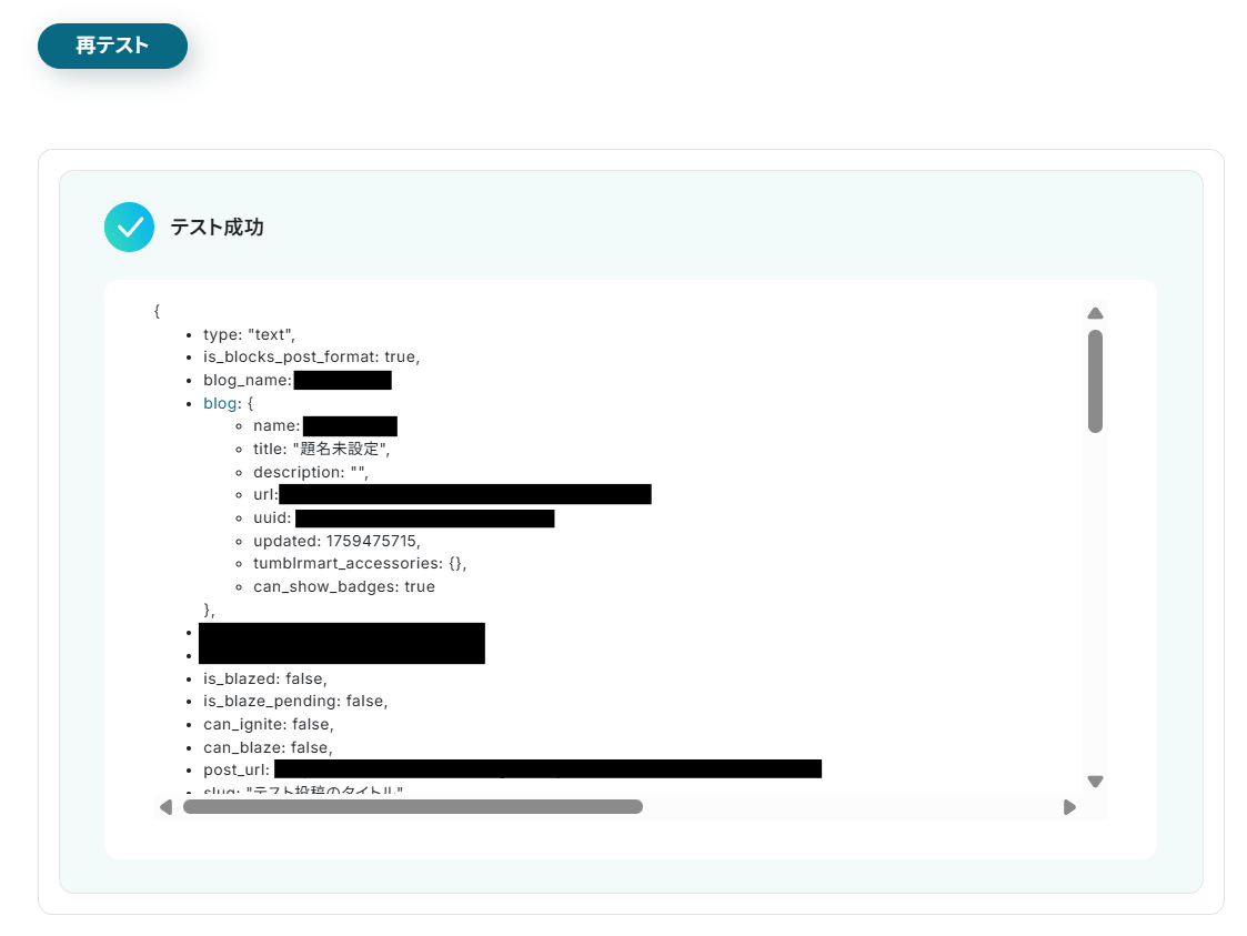 テストが成功するとテスト成功画面と取得した値が表示され、Tumblrのブログデータが確認できます。「保存する」をクリックして完了です! 取得した値について、詳しくはこちら をご参照ください。なお、この取得した値をこの後の設定で活用していきます。
