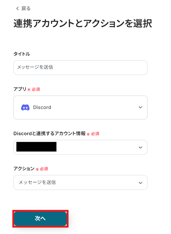 Discordと連携するアカウント情報:フローと紐づけるアカウントを選択してください。 対象のアカウントがリストに表示されていないときは「アカウントを追加」から追加が可能です。
