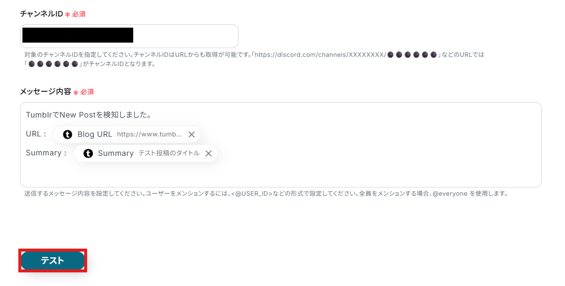 設定が完了したらテストボタンをクリックしましょう。(※実際にDiscordにメッセージが送信されます。)
