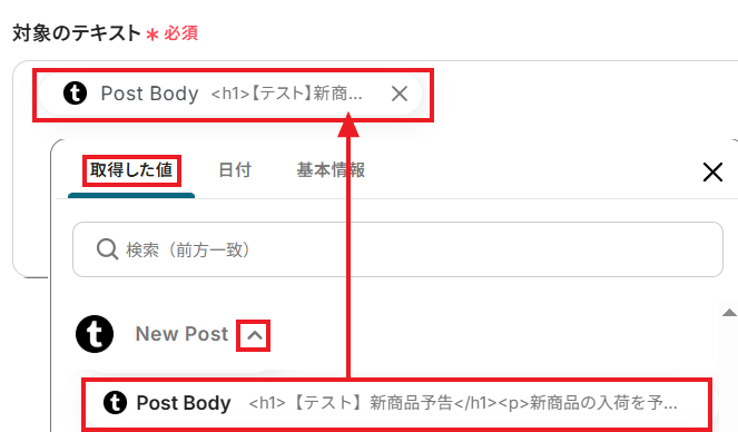 例として、Tumblrに投稿されたテキスト本文である「Post Body」を選択してみましょう。