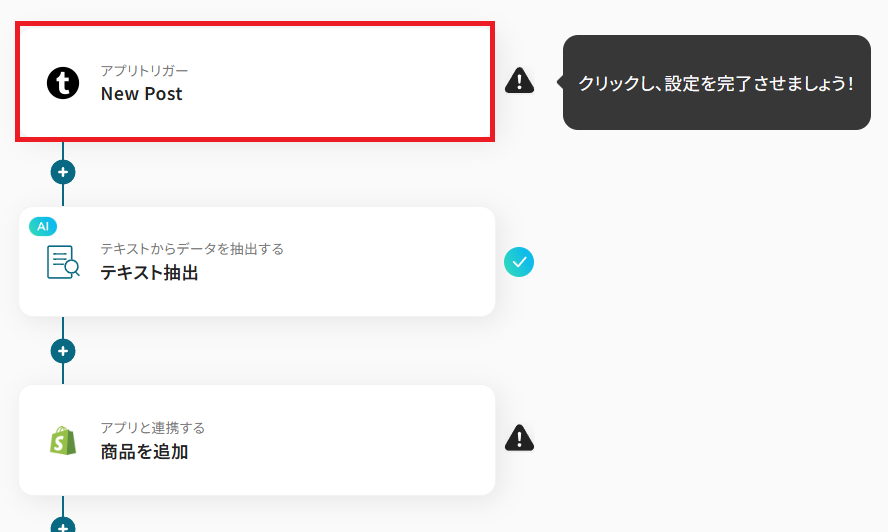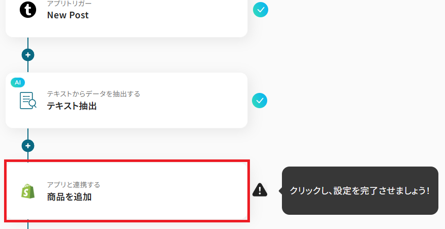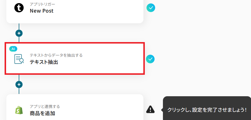Tumblrで新しい投稿があったことをYoomで検知したら、その投稿内容からShopifyに連携するために必要な情報を、YoomのAI機能を使って抽出していきましょう。