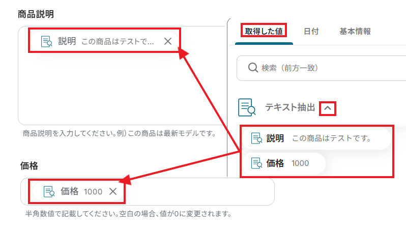 AIが情報を抽出する「対象のテキスト」を、取得した値の中から設定します。