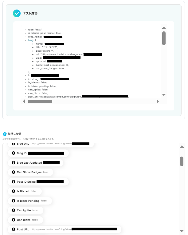 「テスト成功」の文字とリクエスト内容がJSON PATHで表記され、共に「取得した値」として、Tumblrに投稿した内容が反映されていれば成功です!