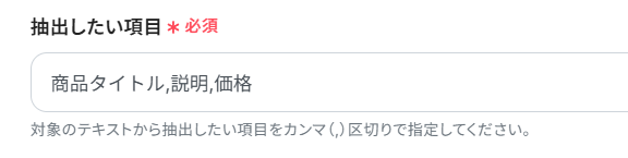 次に、対象のテキストから抽出したい項目をカンマ区切りで入力してください。