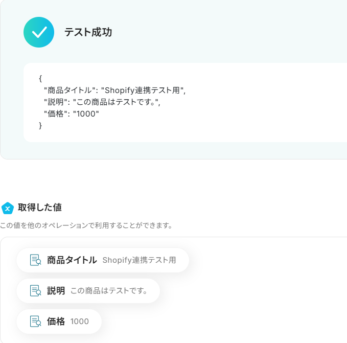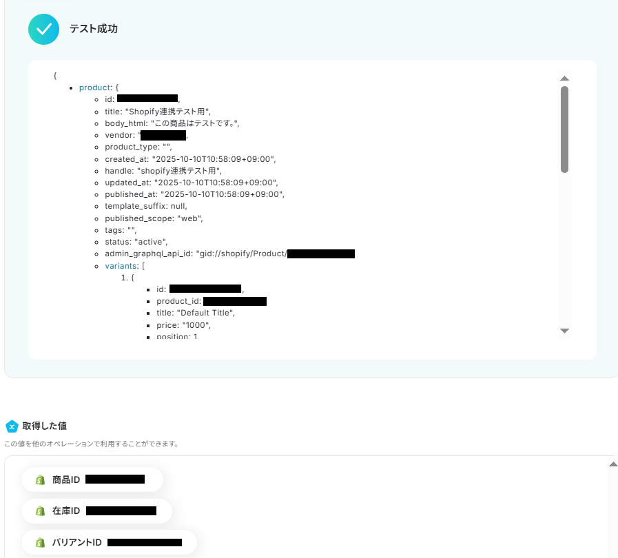 ここで取得した値を活用することにより、今後新たにTumblrで投稿が行われる度、自動でAIが抽出したテキスト情報がShopifyに連携されていきます。