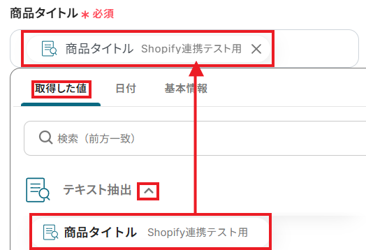 「商品タイトル」は前ステップでAIから抽出したテキストを使います。取得した値から選択してください。