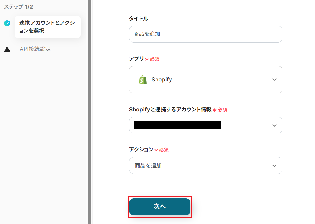 タイトルを任意で設定し、Shopifyと連携するアカウントやアクション内容を確認したら「次へ」を押してください。