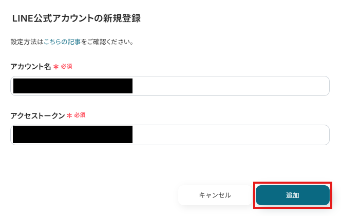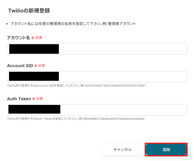 次の画面で、必須項目を入力し、「追加」をクリックします。