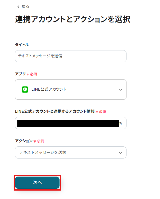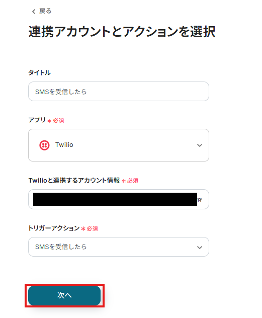 2.表示された画面で必須項目を入力します。トリガーアクションはそのままにして、「次へ」をクリックしましょう。