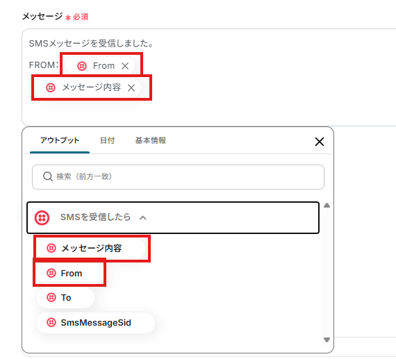 「メッセージ」は、入力欄をクリックして表示されるアウトプットから選択できます。