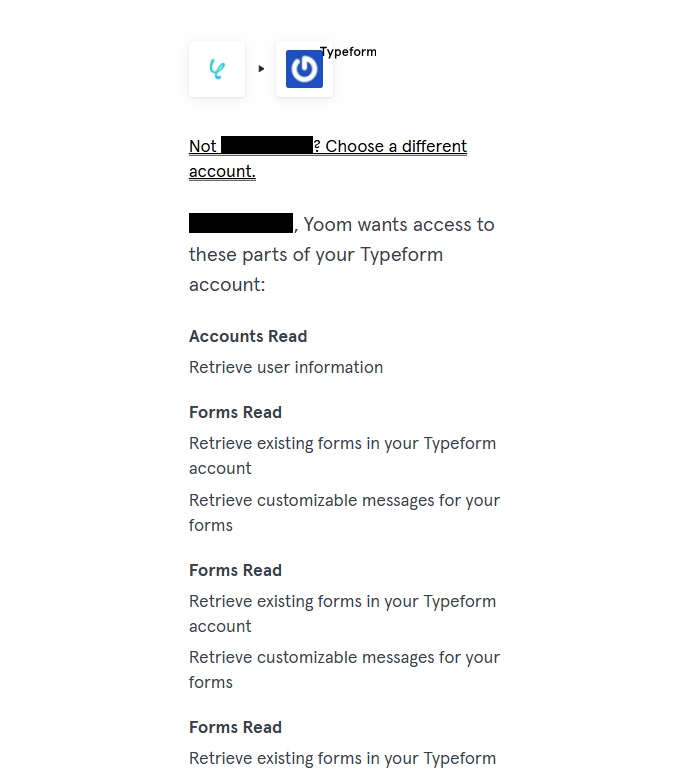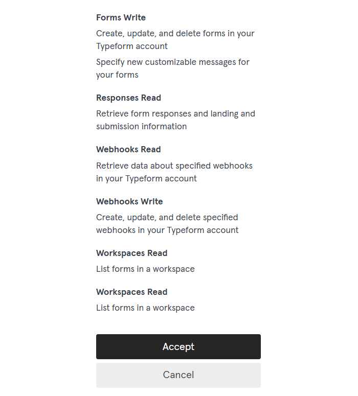 - YoomからTypeformへのアクセス権限の内容を確認し、ページ下部の「Accept」をクリック。