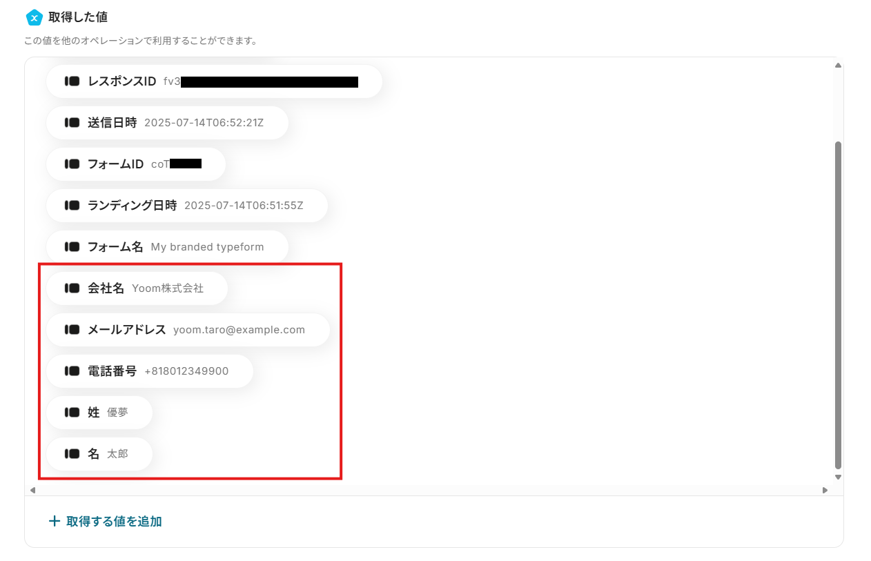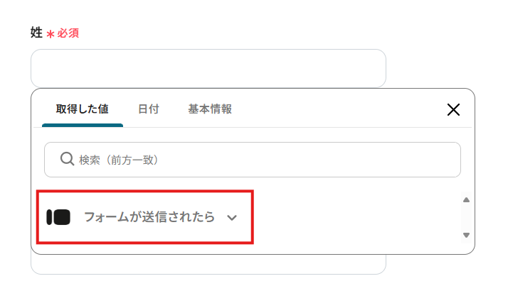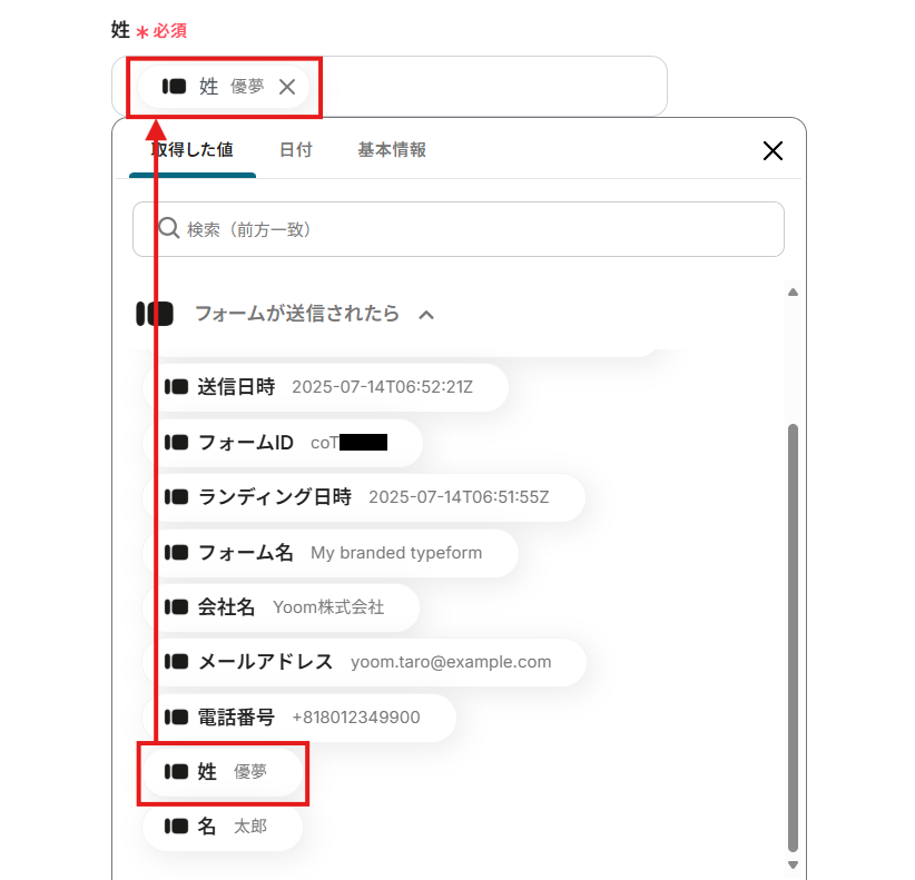 項目をクリックすると、入力欄に{{項目名 取得した値}}という形で追加されます。