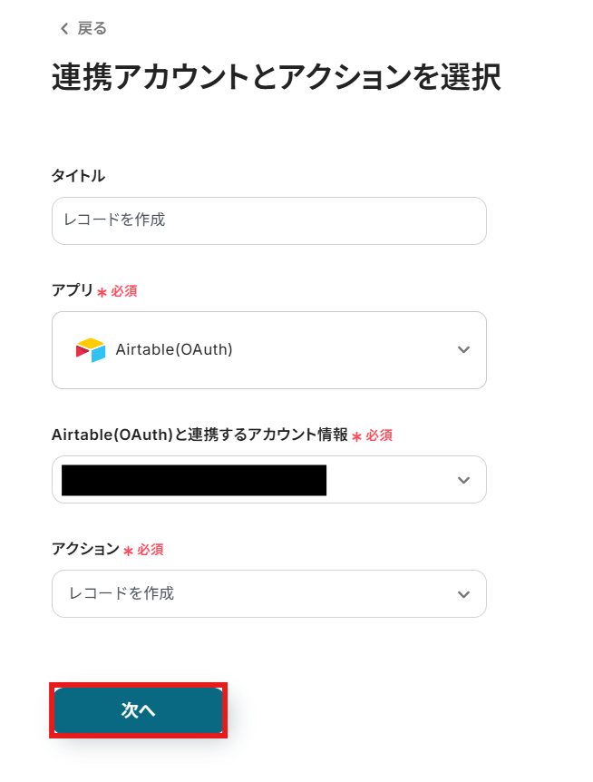 - 最後に、オペレーションでAirtableを選択し、「レコードを作成」アクションを設定して、Typeformから取得した情報をAirtableの指定のテーブルに追加します