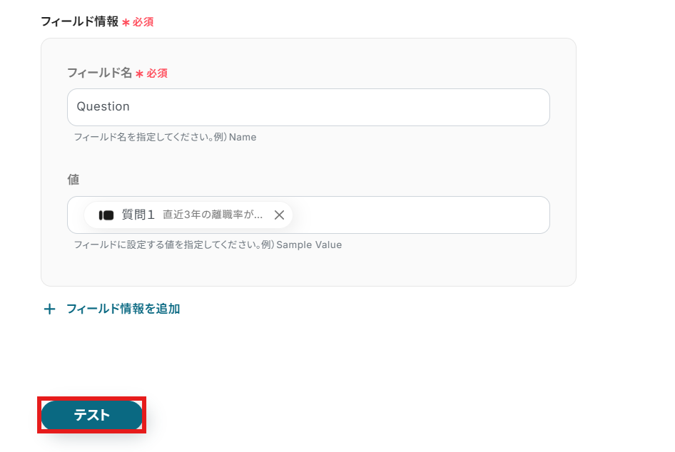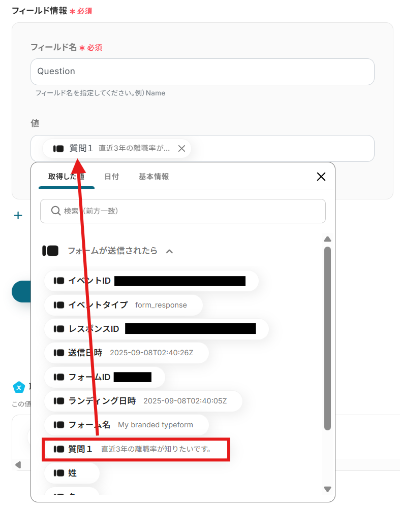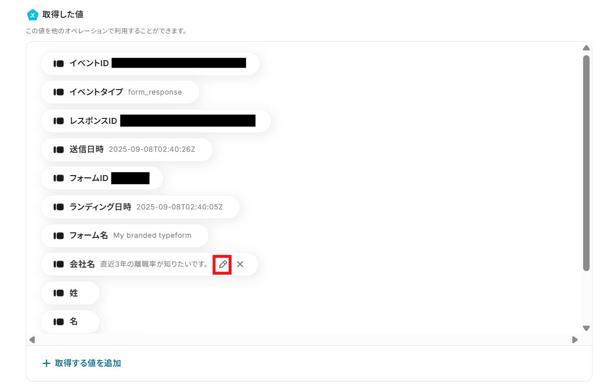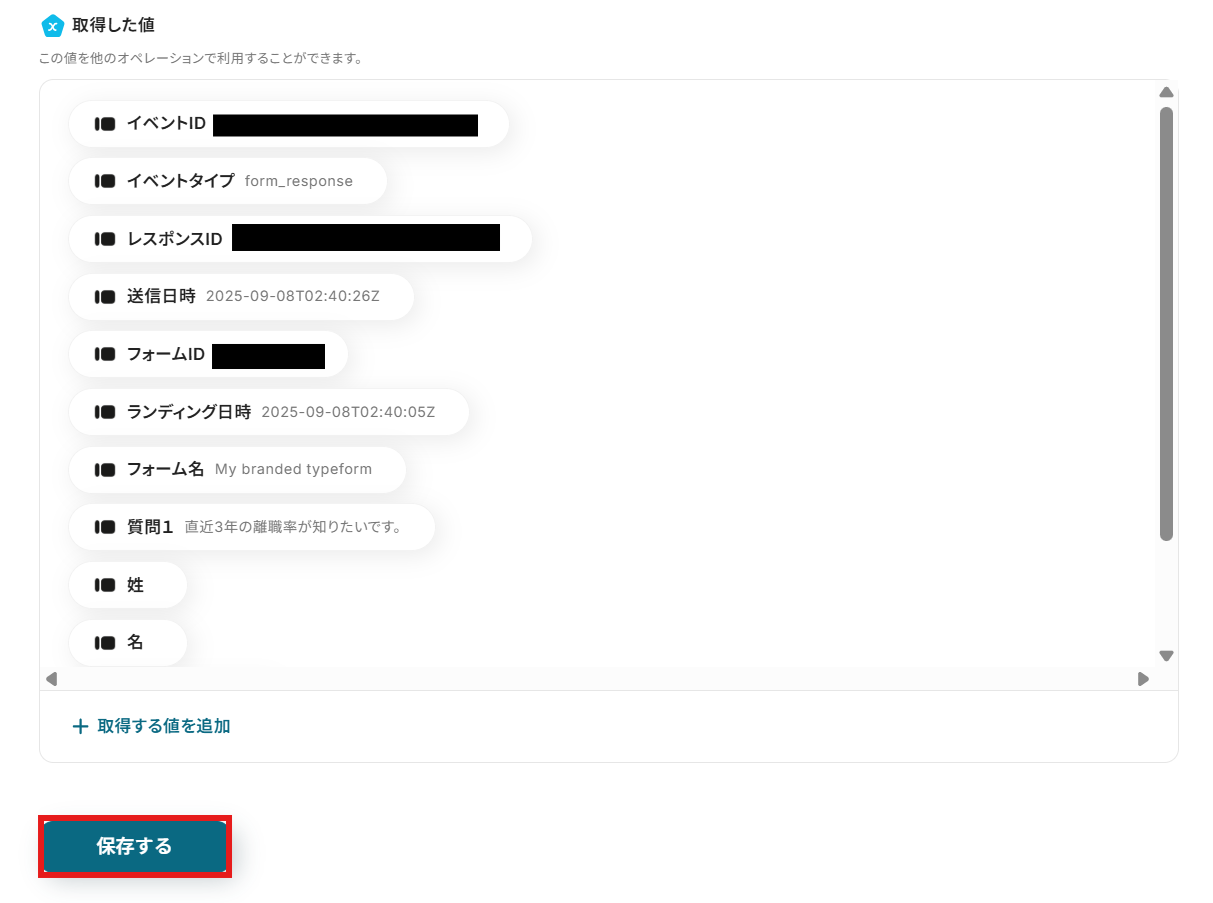 ただ、記事内でも記載したように、Typeformに設定した質問内容の回答が送信された際は事前に取得した値を手動で追加する必要があります。こちらのページを参考にしてください。