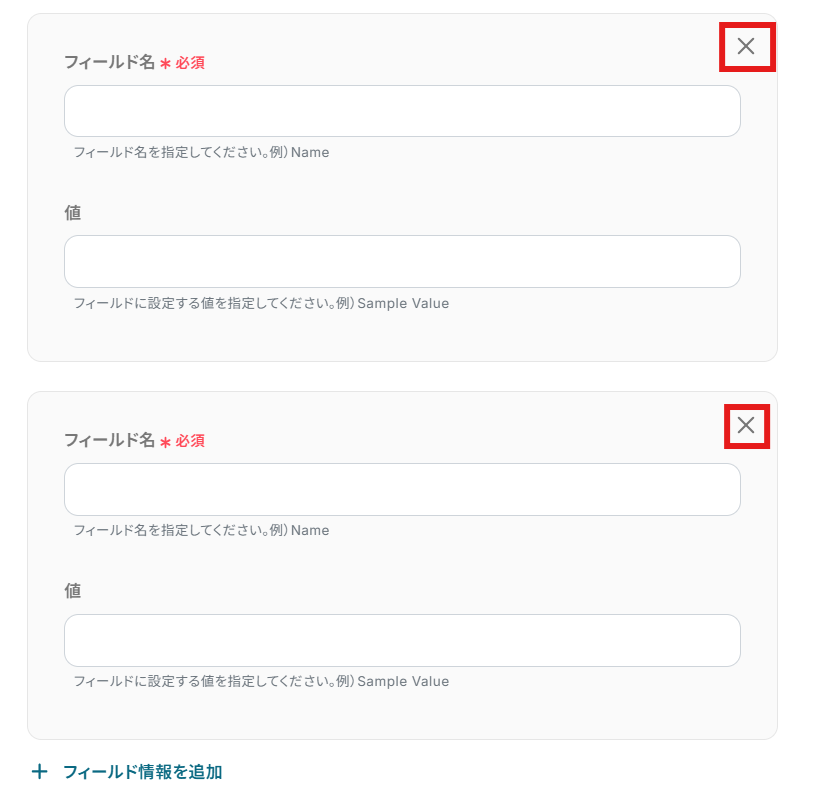 - Airtableのオペレーション設定では、レコードを追加したいベースのIDとテーブルのIDまたは名前をそれぞれ指定し、登録するフィールド情報を任意で設定します。
