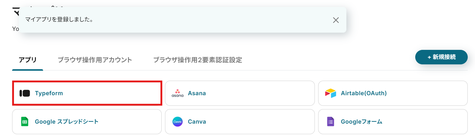 - アプリ:マイアプリ連携をした「Typeform」が反映されていることを確認しましょう。