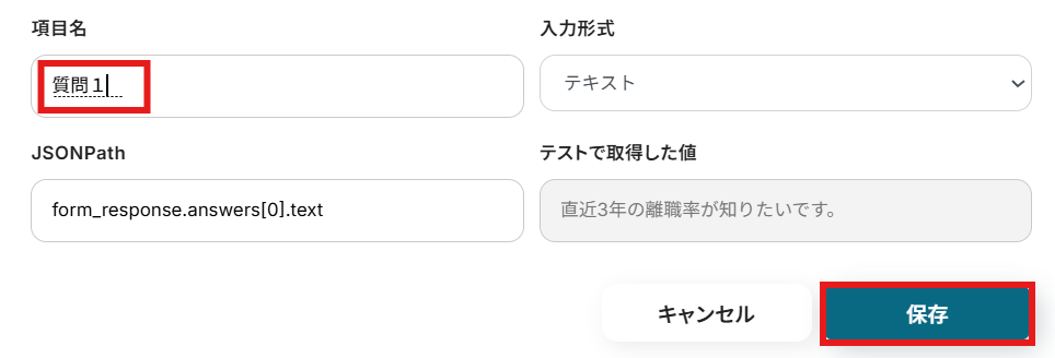 項目名を会社名から質問1に変更し、保存するボタンをクリックして下さい。